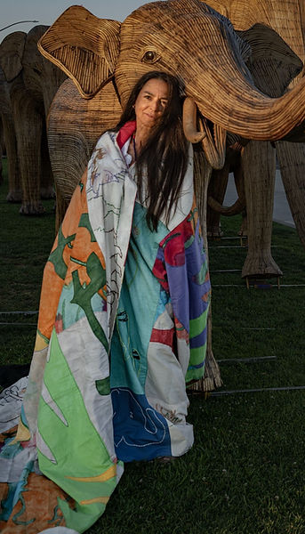 Two blankets made on behalf of The Great Elephant Migration as part of a collection to mark its completion - a traveling art exhibit of 100 magnificent life-size elephants sharing a story of human-wildlife coexistence. Inspired by Indigenous traditions of bestowing blankets to honor meaningful endings and show respect, each blanket is a unique celebration of coexistence and a beautiful way to carry the herd’s story forward. All proceeds from the sale of the blankets will help power human-wildlife coexistence projects supported by The Great Elephant Migration.